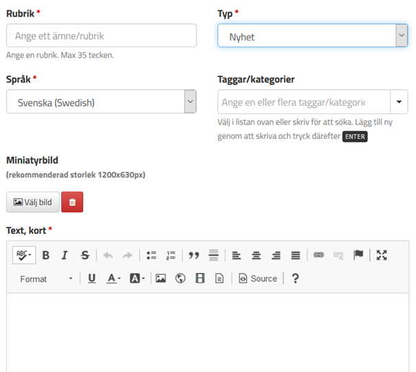 Klicka på Lägg till högst upp till höger. Ange rubrik, vilken typ av nyhet (publik eller privat (för medlem och ledare)) och en text. Det går även att lägga till en bild som visas ovanför nyheten.