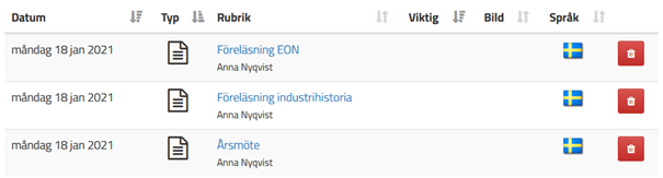 Klicka på rubriken för att redigera en nyhet, eller på den röda ikonen med en papperskorg för att radera.