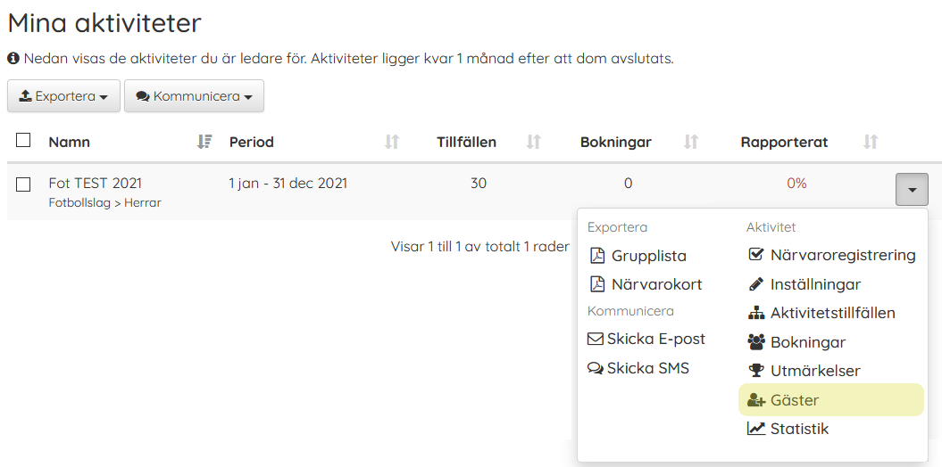 För att hantera gäster (ledare / deltagare). för din aktivitet, klicka på pilen på raden och välj Gäster.