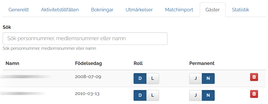 Sök på namn, medlemsnummer, personnummer etc. för att hitta en gäst. Klicka på namnet i listan för att inkludera.