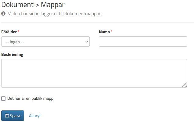 Gå till Mappar > Lägg till för att skapa nya mappar. Ange en förälder, ett namn, om mappen ska vara publik på hemsidan och ev beskrivning av vilken typ av filer mappen innehåller. Om inställning för publik mapp är gjord kommer eventuella undermappar ärva denna inställning från Föräldern.