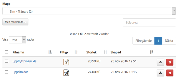 Välj Mapp högst upp på sidan. Klicka på knappen till vänster om papperskorgen för att ladda hem filen, eller klicka på papperskorgen längst ut på raden för en fil för att radera den. Genom att trycka på filnamnet går det att ändra filnamn.