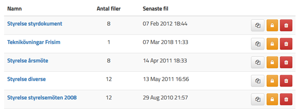På översikten visas alla mappar, dess indelning, datum för senaste fil etc. Längst ut på varje rad finns verktyg för att kopiera snabblänk till en mapp, som t.ex. kan användas vid ett medlemsutskick. Klicka på hänglåset för att ange behörigheter.