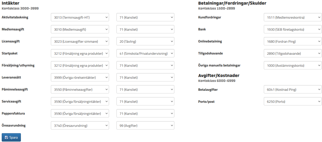 På samma sida, klicka på fliken Kontering. Välj konto/kostnadsställen för resp. avgift.